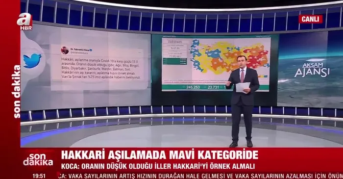 Sağlık Bakanı Fahrettin Koca sosyal medya hesabı Twitter üzerinden yaptığı paylaşımda "Hakkâri, aşılanma oranıyla Covid-19’a karşı güçlü 13 il arasında. Oranın düşük olduğu Iğdır, Ağrı, Muş, Bingöl, Bitlis, Diyarbakır, Şanlıurfa, Mardin, Batman, Siirt, Hakkâri’nin aşı kararını, aşılanma hızını örnek almalı. Van’la Şırnak’tan %75’imiz aşılandık haberini bekliyoruz." ifadelerini kullandı.