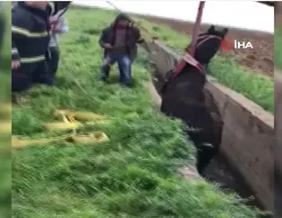 Şanlıurfa’nın Suruç ilçesinde arıtma tesisine ait kanala düşen at, itfaiye ekiplerince kepçe yardımıyla kurtarıldı.