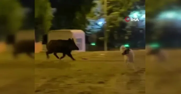Mahalle sakinleri tarafından çekilip sosyal medyada paylaşılan görüntülerde bir yaban domuzu ilçenin sokaklarına inerek sokak köpeklerini kovaladı.