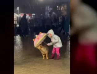 Beş yaşındaki küçük kız, şemsiyesini köpekle paylaşmaya karar veriyor...