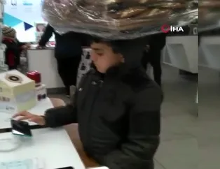 Bayiye giren ve kafasında simit tablası bulunan çocuk, bir yandan simitleri düşürmemeye çalışırken bir yandan da bayideki teşhir ürünü telefonlardan birinde oymaya çalıştı. Oyuna kendisini kaptıran çocuk, bir anda kendisini çeken kişiyi fark edince koşar adımlarla dükkandan uzaklaştı.