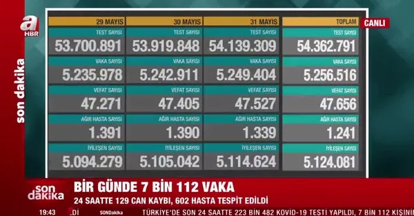 Tabloya göre son 24 saatte 129 kişi korona virüsten hayatını kaybetti, toplam can kaybı 47 bin 656'a yükseldi. Toplamda 54 milyon 362 bin 791 test yapıldı. Bugün yapılan 223 bin 482 testten, 7 bin 112 yeni vaka sayısı, 602 kişi de yeni hasta sayısı olduğu belirtildi. Toplam vaka sayısının 5 milyon 256 bin 516 olduğu, bugün iyileşen 9 bin 457 kişiyle birlikte toplam iyileşen hasta sayısının 5 milyon 124 bin 81'e yükseldiği, toplam hastalarda zatürre oranının yüzde 2,8, ağır hasta sayısının ise bin 241 olduğu açıklandı.