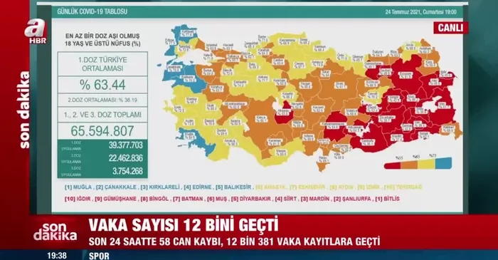 Sağlık Bakanlığı, ’Türkiye Covid- 19 Hasta Tablosu’ verilerini paylaştı. Türkiye’de son 24 saatte 221 bin 463 Kovid-19 testi yapıldı, 12 bin 381 kişinin testi pozitif çıktı, 58 kişi hayatını kaybetti. Öte yandan Kovid-19'la mücadele kapsamında son 24 saatte birinci, ikinci ve üçüncü doz toplam 1 milyon 106 bin 966 aşı uygulandı. Sağlık Bakanı Fahrettin Koca sosyal medya hesabı üzerinden yapıtığı paylaşımda, "Vaka sayılarındaki artış devam ediyor. Bu durum hastaneye yatışlara da yansıyabilir. Bundan korunmanın yolu tedbirlere uymak ve aşı olmak." ifadelerini kullandı. Son dakika gelişmesinin ayrıntıları haberimizde...