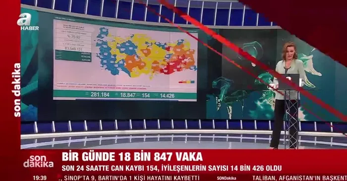 Sağlık Bakanlığı tarafından Türkiye'nin yeni korona virüs tablosu açıklandı. 15 Ağustos'ta açıklanan 24 saatlik verilere göre 18 bin 847 vaka tespit edildi. Virüs nedeniyle hayatını kaybedenlerin sayısı 154 oldu. Son 1 günde toplam 281 bin 184 test yapılırken, iyileşen hasta sayısı 14 bin 426 olarak kaydedildi. Sağlık Bakanlığı tarafından açıklanan tabloda, aşılama verilerine de yer verildi. En az 1 doz aşı olmuş 18 yaş üzeri nüfusu kapsayan verilere göre Türkiye'de 1. doz aşılama ortalama yüzde 70,92 oldu. 2. doz ortalaması yüzde 53,03 olurken, 1., 2. ve 3. doz aşısını olan vatandaş sayısı toplamda 83 milyon 549 bin 131'e yükseldi.