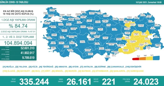 Son dakika haberi... Türkiye'nin 18 Eylül 2021 - Cumartesi gününe ait koronavirüs (Kovid-19) tablosu açıklandı. Sağlık Bakanı Fahrettin Koca'nın sosyal medya hesabından duyurduğu verilere göre; Son 24 saatte 335 bin 244 Kovid-19 testi yapıldı, 26 bin 161 kişinin testi pozitif çıktı, 221 kişi hayatını kaybetti.