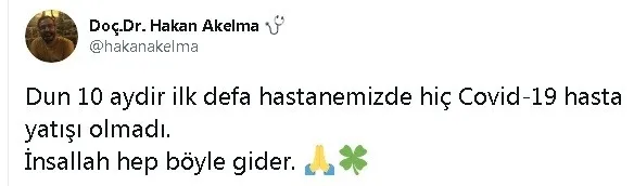 Doç. Dr. Akelma sosyal medya hesabından yaptığı açıklamada, "Dün 10 aydır ilk defa hastanemizde hiç korona virüs hasta yatışı olmadı. İnşallah hep böyle gider" paylaşımda bulundu.
