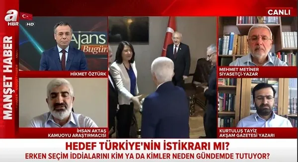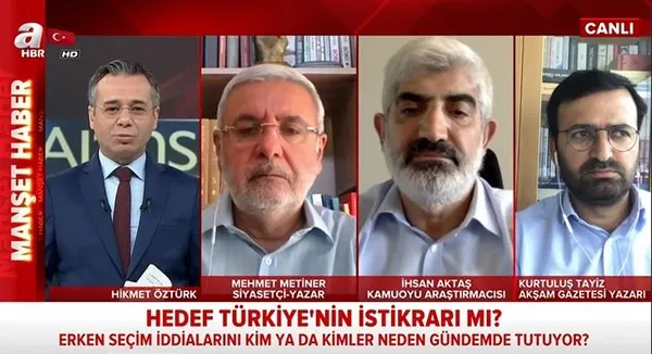 Son dakika haberi... Araştırmalar gösteriyor ki bugün seçim olsa mevcut tablodan çok da farklı bir sonuç ortaya çıkmayacak. Sadece gündem meşgul edilecek ve biriken yapısal çözümler ötelenmiş olacak. Durum böyleyken neden erken seçim tartışmaları çıkarılıyor? Kamuoyunun böyle bir beklentisi var mı? Erken seçim tartışmalarının amacı ne? Hedef Türkiye'nin istikrarı mı? Siyasetçi Yazar Mehmet Metiner, GENAR Başkanı kamuoyu araştırmacısı İhsan Aktaş ve Akşam Gazetesi yazarı Kurtuluş Tayiz, A Haber canlı yayınında konu ile ilgili açıklamalarda bulundu.