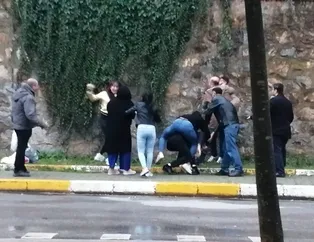 Sokak ortasında yaşanan kavga anları ve kadının yere düşen adama tekme ve taşla müdahalesi cep telefonu kamerasına yansıdı. Görüntülerde şahıslar birbirleriyle kavga ediyor. Bir kadın da yere düşen adama tekme atıyor ardından taş ile saldırmaya çalışıyor.