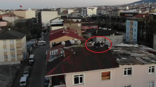 Sultanbeyli'de çatıya çıkan gençler, devriye ekipleri tarafından drone'la uyarıldı. Polis, gençlere, "Ne işiniz var çatıda? İnin aşağı!" anonsu yaptı.Gençler de polisin uyarısı sonrası aşağıya indi.
