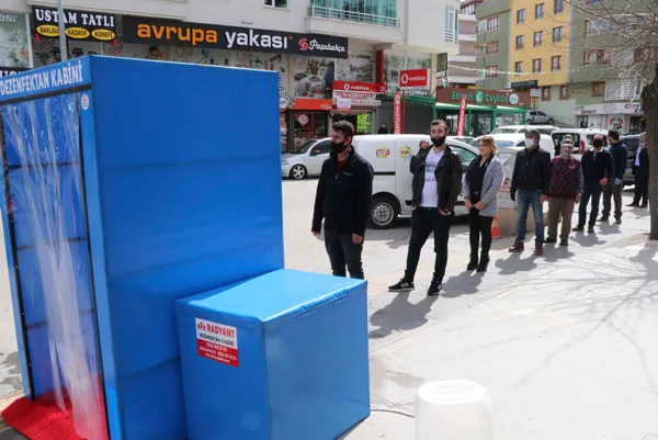 Firma sahibinin arkadaşının iş yeri önünde cadde üzerine konulan dezenfeksiyon kabinine çevredekiler yoğun ilgi gösterdi. Vatandaşlar, kabinden geçerek dezenfekte olabilmek için kuyruk oluşturdu. Sıraya girenler, virüsten korunmak için sosyal mesafe kuralına uygun bekledi. Dezenfekte olabilmek için elinde köpeği ile bile kabine giren oldu.