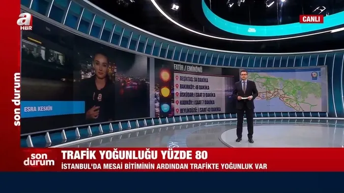 A Haber muhabiri Esra Keskin canlı yayında İstanbul'daki sisin trafik yoğunluğunu olumsuz yönde etkilediğini ve ilerleye dakikalarda yoğunluğun daha da artmasının beklendiğini belirtti.