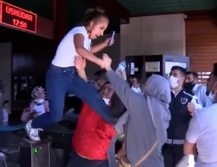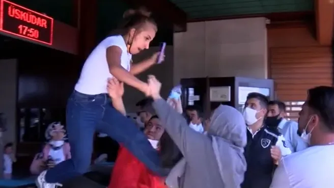 Eminönü'nden, Üsküdar'a gitmek isteyenler iskele önünde uzun kuyruk oluşturdu. İskelede bekleyen iki kadın arasında ise kavga çıktı. Kadınlardan biri önünde bekleyen kadınla yavaş hareket ettiği için tartışmaya başladı. Tartışma kısa sürede kavgaya dönüştü. Kadınlardan biri turnike üzerine çıkarak tartıştığı kadına uçan tekme attı. İskeledeki güvenlik görevlileri kavgayı ayırdı.