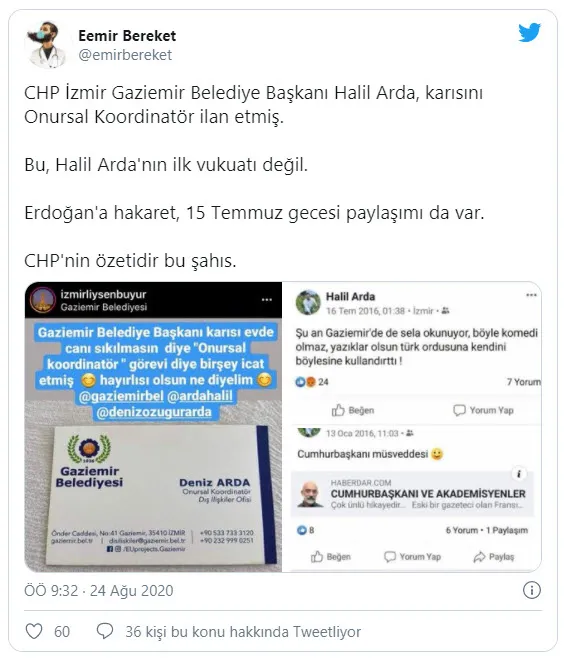 Deniz Arda'nın, Gaziemir Belediyesi ismi ve logosuyla bastırdığı kartvizitte 'Onursal Koordinatör - Dış İlişkiler Ofisi' sıfatını kullandığı görüldü.