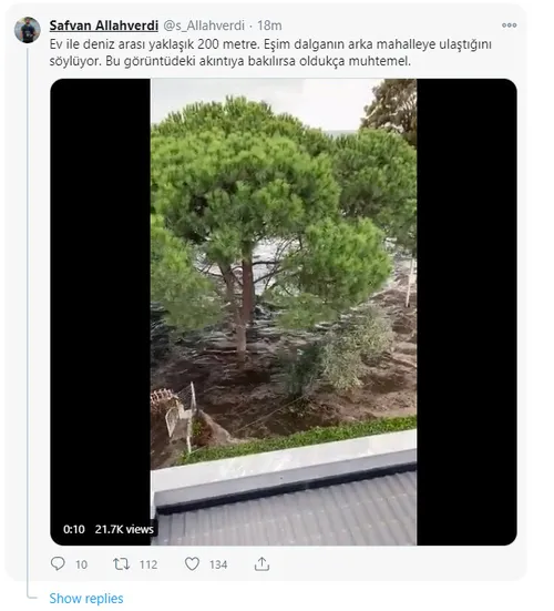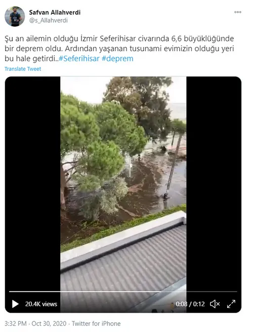 Bir vatandaş sosyal medya hesabından paylaştığı videoda "Şu an ailemin olduğu İzmir Seferihisar civarında 6,6 büyüklüğünde bir deprem oldu. Ardından yaşanan tsunami evimizin olduğu yeri bu hale getirdi. Ev ile deniz arası yaklaşık 200 metre. Eşim dalganın arka mahalleye ulaştığını söylüyor. Bu görüntüdeki akıntıya bakılırsa oldukça muhtemel." ifadelerini kullandı.