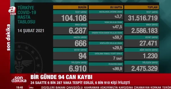 Haftalık verilere göre, bu hafta hastalarda zatürre oranı yüzde 3,7, yatak doluluk oranı yüzde 47,5, erişkin yoğun bakım doluluk oranı yüzde 59,7, ventilatör doluluk oranı yüzde 29,5, ortalama temaslı tespit süresi 7 saat, filyasyon oranı yüzde 99,9 olarak kayda geçti.