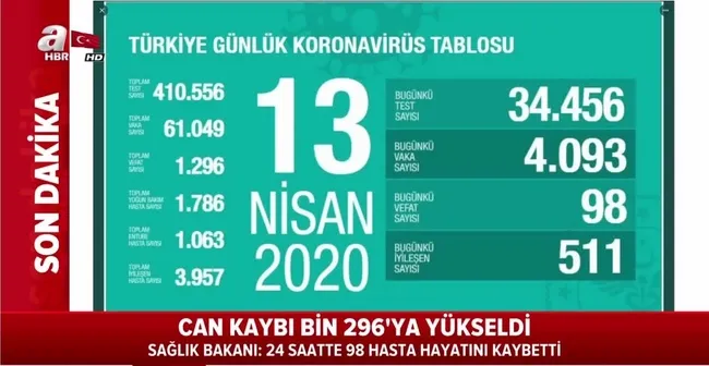 Son dakika haberi... Sağlık Bakanı Fahrettin Koca resmi sosyal medya hesabı üzerinden 13 Nisan Pazartesi gününe ait koronavirüs vaka sayılarını paylaştı. Türkiye'de vaka sayısını 4.093 artışla 61.049'ye yükselirken 98 kişinin yaşamının yitirmesiyle hayatını kaybeden toplam hasta sayısı 1.296 oldu. Peki 13 Nisan Pazartesi günü Türkiye'de kaç kişiye koronavirüs testi yapıldı. Detaylar haberimizde...
