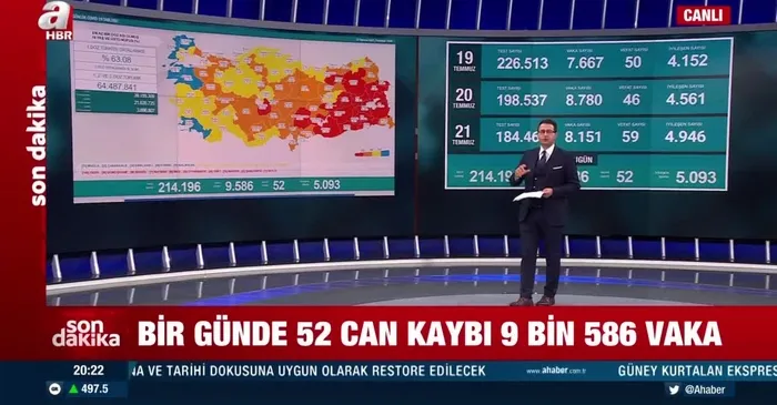 Sağlık Bakanlığı 22 Temmuz 2021 koronavirüs vaka, vefat ve aşı sayılarını içeren son koronavirüs tablosunu paylaştı. Son 24 saatte 214 bin 196 Kovid-19 testi yapıldı, 9 bin 586 kişinin testi pozitif çıktı, 52 kişi hayatını kaybetti. Son zamanların en yüksek vaka sayısına ulaştığımızı belirten Bakan Koca, vatandaşlara aşı çağrısında bulundu. Son dakika gelişmesinin ayrıntıları haberimizde...