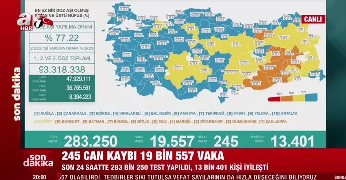 Koronavirüs salgınında bugün 19 bin 557 yeni vaka tespit edilirken, 245 vatandaşımız da yaşamını yitirdi.