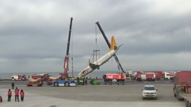 Trabzon'da pistten çıkarak denize 10 metre kala toprağa saplanan yolcu uçağı bulunduğu yerden kaldırıldı. Uçak dev vinçlerle 11 saat süren çalışmayla çıkarılabildi.