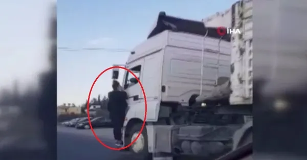 Kahramanmaraş’ta seyir halindeki TIR'ın kapısına tutunarak tehlikeli yolculuk yapan bir kişi adeta kazaya davetiye çıkardı.