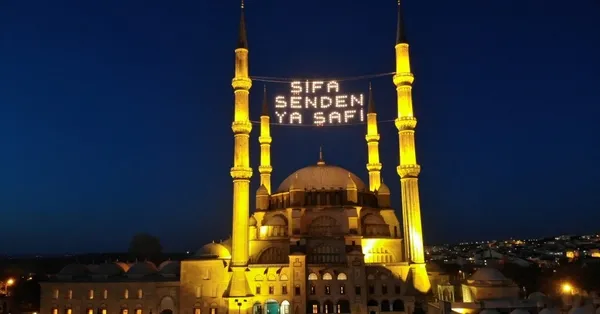 Türk-İslam mimarisinin göz bebeği Selimiye Camii'nde, 4 asırlık mahya geleneği yaşatılıyor. Ramazan-ı Şerif münasebetiyle kadim caminin eşsiz minareleri arasına 'Şifa senden ya şafi' yazılı mahya asıldı.