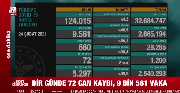Son dakika haberleri... Türkiye'de koronavirüs salgınında bugün 9 bin 561 kişinin testi pozitif çıkarken, son 24 satte 72 vatandaşımız da yaşamını yitirdi. 24 Şubat 2021 Çarşamba gününe ait koronavirüs tablosunun detayları haberimizde...