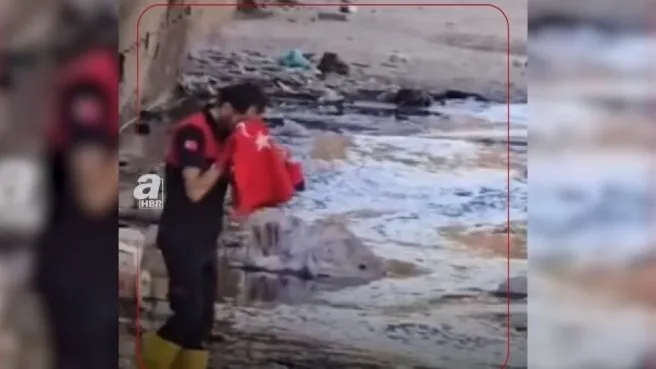 Şanlıurfa'nın Eyyübiye ilçesinde dere yatağına düşen Türk bayrağını yerden alan itfaiye personeli, öpüp alnına koydu.