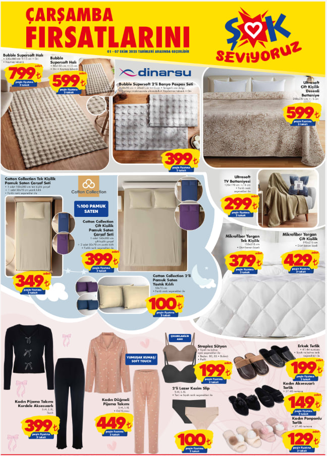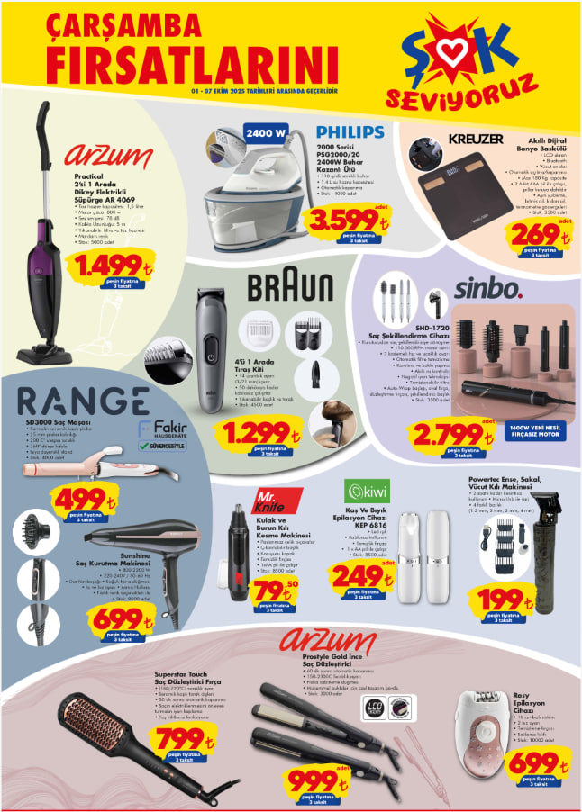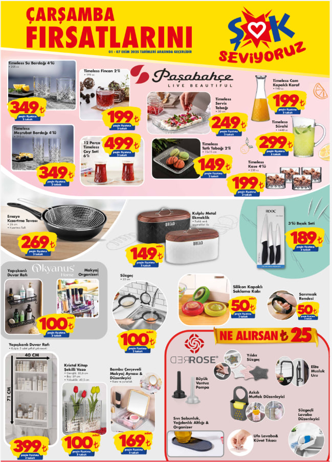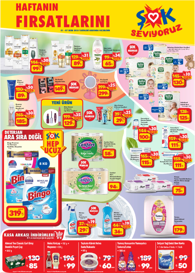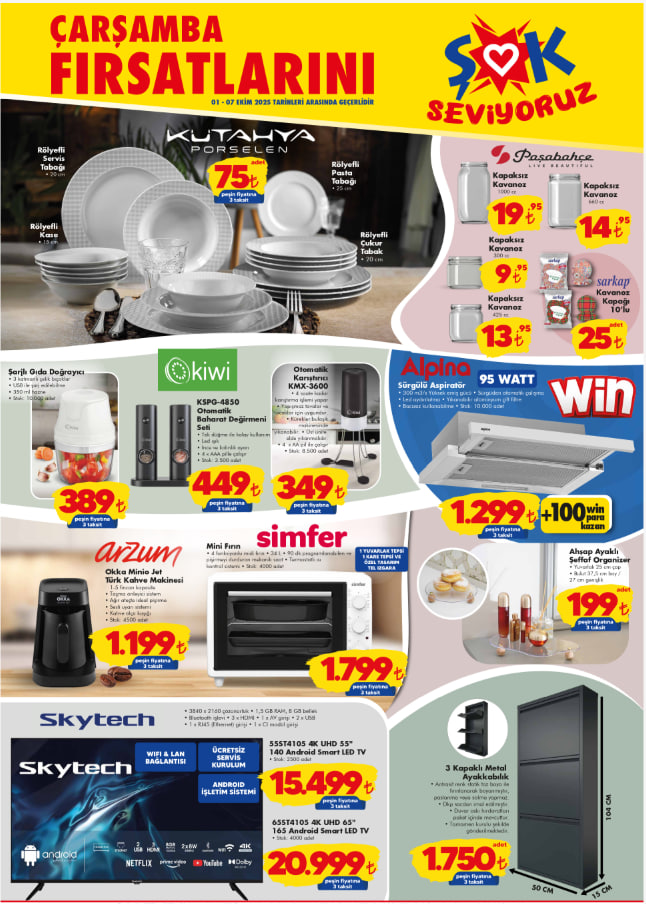 ŞOK, Ekim ayının ilk aktüel katalog dönemini duyurdu. 1-7 Ekim 2025 tarihleri arasında geçerli olacak fırsatlar arasında ev ve mutfak ihtiyaçları, kişisel bakım ürünleri ve ev tekstili dikkat çekiyor. Şofben, su sebili, midi fırın, aspiratör ve ayakkabılık gibi pek çok ürün indirimli fiyatlarla ŞOK raflarında yerini aldı. Peki bu hafta ŞOK aktüel kataloğunda hangi avantajlar var, indirimli ürünler neler? İşte 1-7 Ekim ŞOK aktüel katalog listesi…