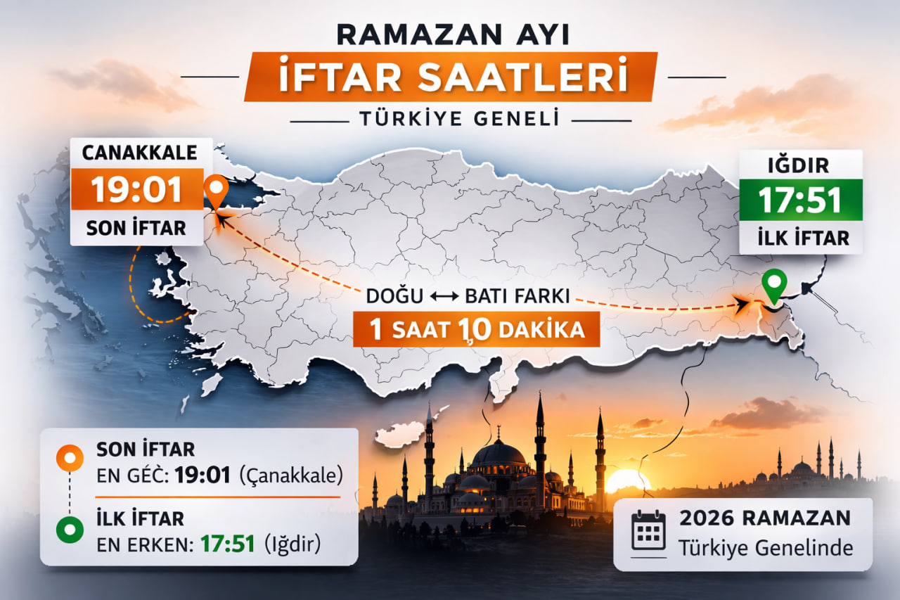 Türkiye'de Ramazan'ın ilk iftarı Iğdır'da açılacak. Doğuda gün batımı daha erken yaşandığı için sofralar da ilk olarak burada kurulacak. Batıya gidildikçe iftar saatleri gecikiyor. Bu nedenle ilk günün son iftarı Çanakkale'de yapılacak.