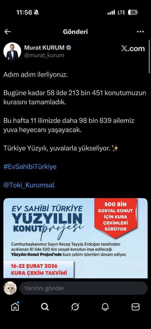 Bakan Murat Kurum, sosyal medya hesabından 16-22 Şubat haftasının kura takvimini paylaştı. Kurum, "Adım adım ilerliyoruz. Bugüne kadar 58 ilde 213 bin 451 konutumuzun kurasını tamamladık. Bu hafta 11 ilimizde daha 98 bin 839 ailemiz yuva heyecanı yaşayacak. Türkiye Yüzyılı, yuvalarla yükseliyor." ifadelerini kullandı.
