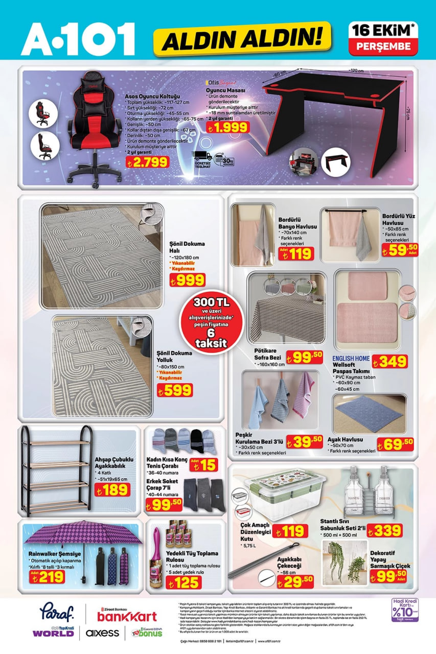 16 EKİM A101 AKTÜEL KATALOG: Sepetler dolup taşacak: Şemsiye 219 TL, ikiz balık tavası 499 TL, ev terliği 75 TL