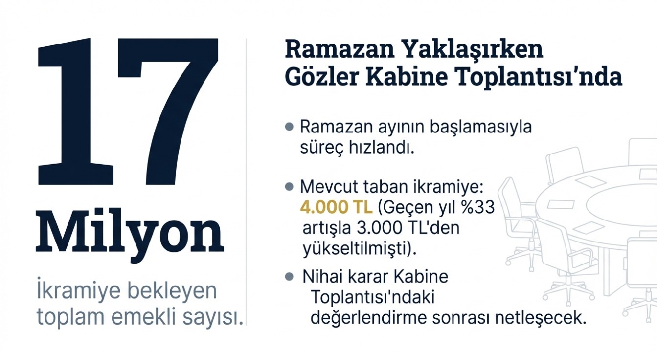 Ramazan ayının başlamasıyla birlikte 17 milyon emeklinin beklediği bayram ikramiyesi için gözler bugün yapılacak Kabine Toplantısı'na çevrildi. Geçen yıl 4 bin liraya yükseltilen ödeme için bu yıl yüzde 12,19 ile yüzde 35 arasında değişen artış senaryoları masada bulunurken, kesin tutarın toplantı sonrası netleşmesi bekleniyor; ilk ödemenin ise 20-22 Mart'taki Ramazan Bayramı öncesinde hesaplara yatırılacağı öngörülüyor.