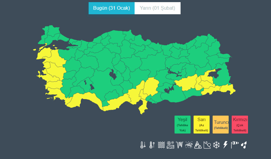 Kıyı Ege, Akdeniz kıyıları, Güneydoğu Anadolu'nun batısı ile Çanakkale, Tekirdağ, Kahramanmaraş, Bingöl, Muş, Bitlis, Şırnak ve Hakkari çevrelerinde yağışlar kuvvetli görülüyor. Antalya'nın doğusu ile Hatay ve Osmaniye'de ise yer yer çok kuvvetli sağanak etkili oluyor. Sel, su baskını, ulaşımda aksamalar ve ani kar erimesine karşı tedbir çağrısı yapıldı.