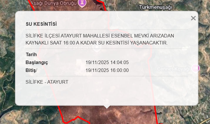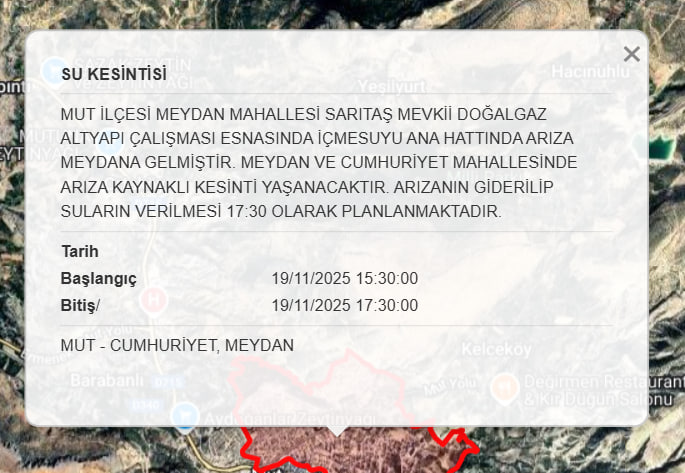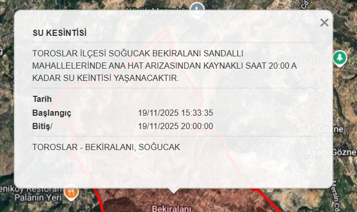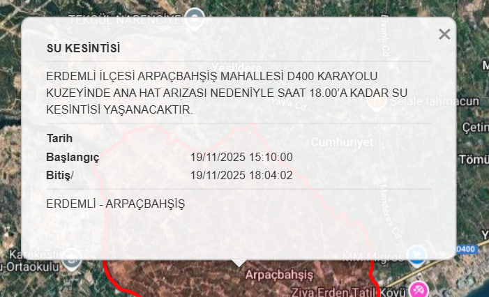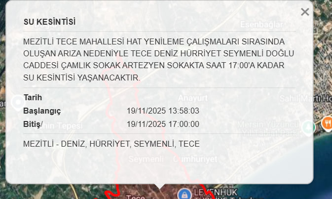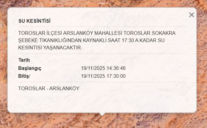 MESKİ'nin duyurusuna göre 19 Kasım 2025 Çarşamba günü Mersin'in Tarsus, Toroslar ve Anamur gibi birçok ilçesinde su kesintileri yaşanıyor. Kent genelinde "Su ne zaman yeniden verilecek?" sorusu vatandaşların gündemindeki yerini koruyor.