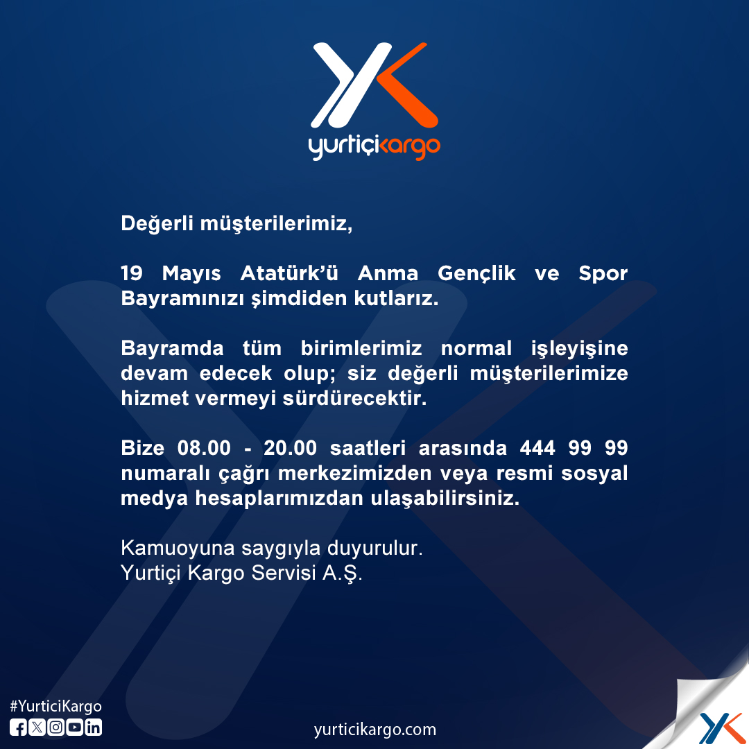 Yurtiçi Kargo, 19 Mayıs Pazartesi günü tüm birimlerinin açık olacağını ve hizmet vermeye devam edeceklerini açıkladı. Resmi sosyal medya hesabından yaptığı duyuruda şu ifadeler kaydedildi: