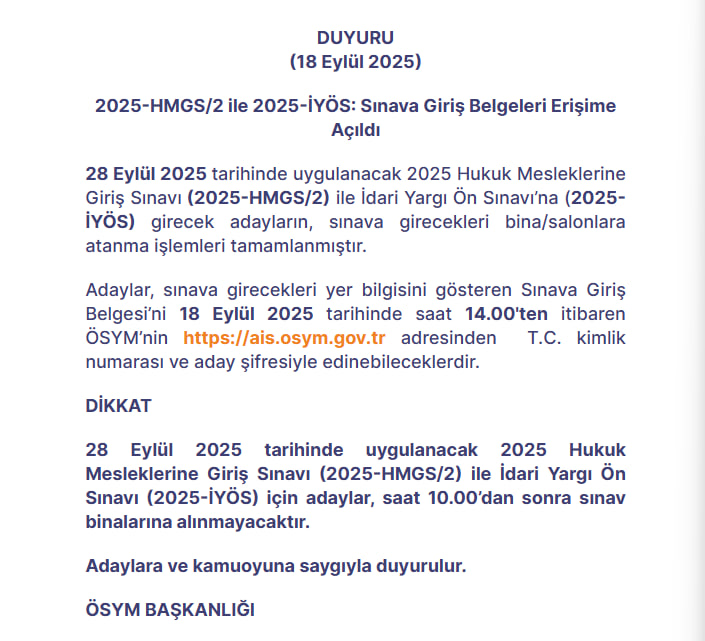2025 HMGS/2 ve İYÖS sınavları, ÖSYM'nin açıkladığı sınav takvimine göre 28 Eylül 2025 Pazar günü saat 10.15'de gerçekleştirilecek. Saat 10.00'dan sonra sınav binalarına giriş yapılmayacak.