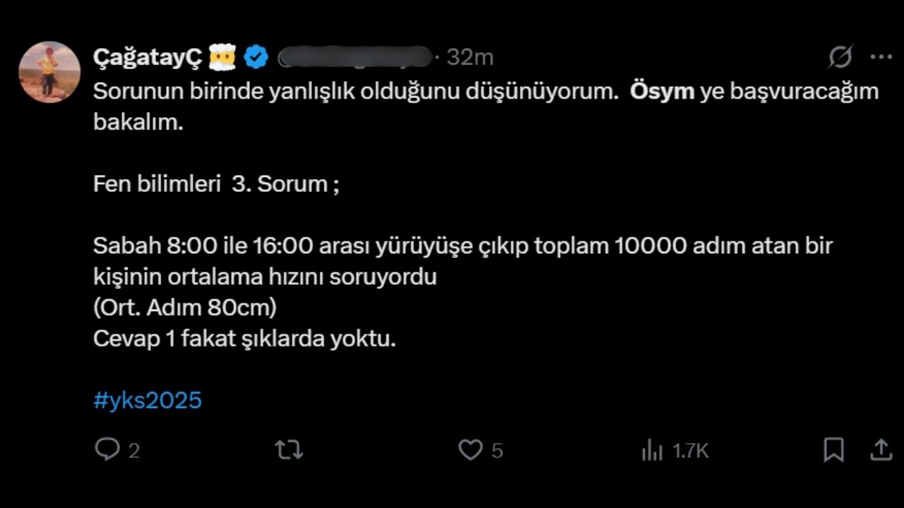 🔸"Sorunun birinde yanlışlık olduğunu düşünüyorum. Ösym ye başvuracağım bakalım.