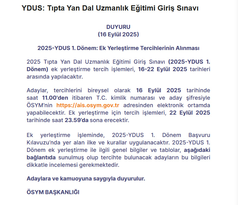 ÖSYM, 2025 YDUS 1. dönem ek yerleştirme tercih sürecini duyurdu. Tıpta yan dal uzmanlık eğitimi almak isteyen adaylar, 16 Eylül 2025 saat 11.00'den itibaren tercihlerini elektronik ortamda gerçekleştirebilecek.