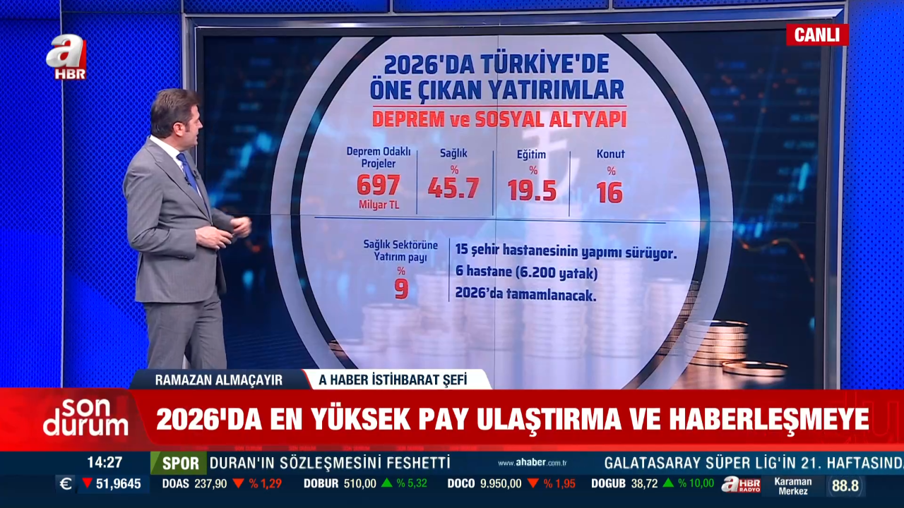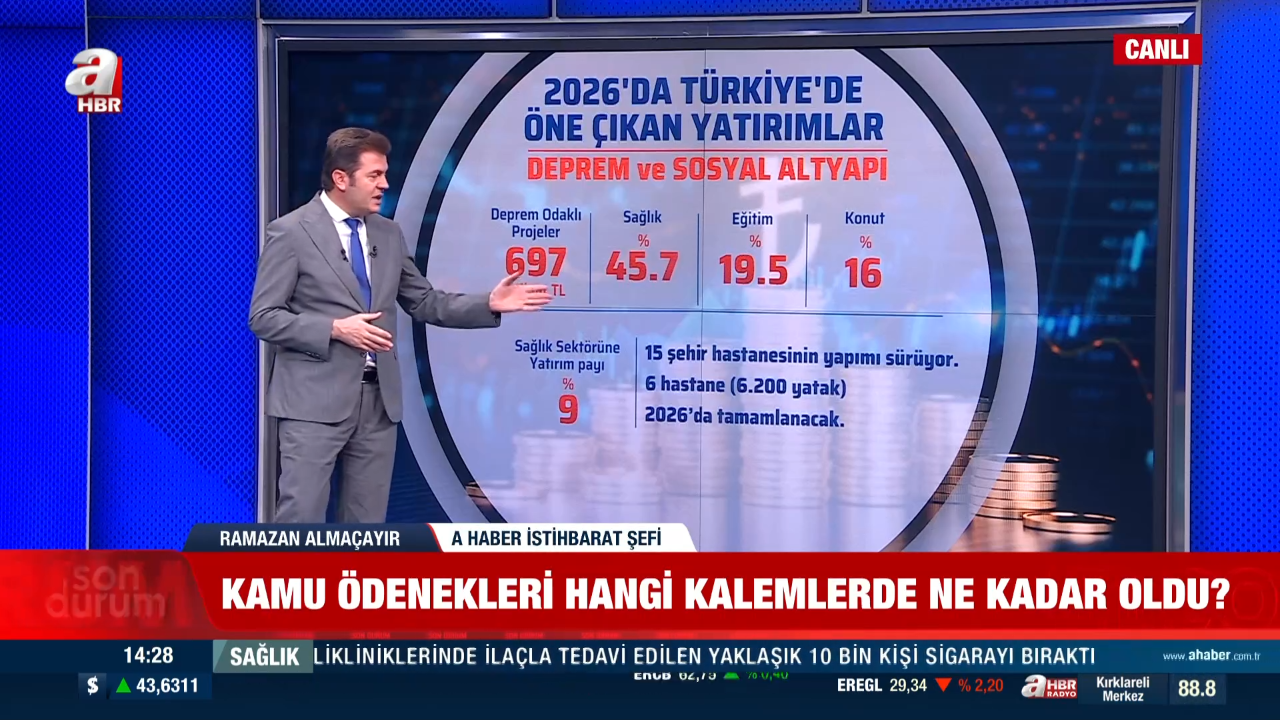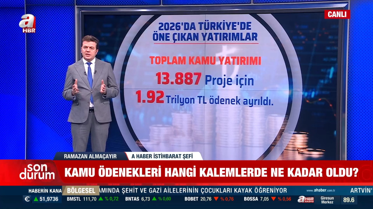 2026 Kamu Yatırım Programı'nda 13 bin 887 projeye 1 trilyon 920 milyar 800 milyon lira ayrıldı. En büyük pay 697 milyar lirayla deprem bölgesine verildi. Sağlık, sanayi, Ar-Ge ve üniversite yatırımları öne çıktı. Detayları A Haber İstihbarat Şefi Ramazan Almaçayır açıkladı.