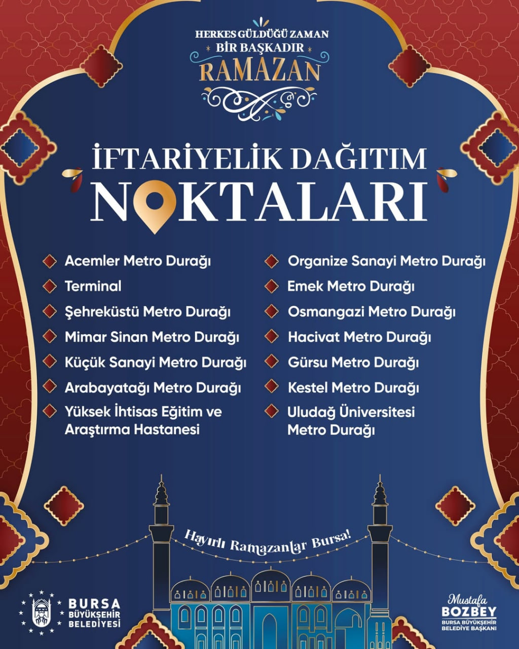 Bu yıl da Ramazan boyunca sosyal dayanışmayı artırmayı hedefleyen geniş kapsamlı programlar hazırladı. Kurulan çadırlar yalnızca ihtiyaç sahiplerine değil; öğrenciler, çalışanlar, yolda kalanlar ve iftara yetişemeyen vatandaşlara da açık olacak.