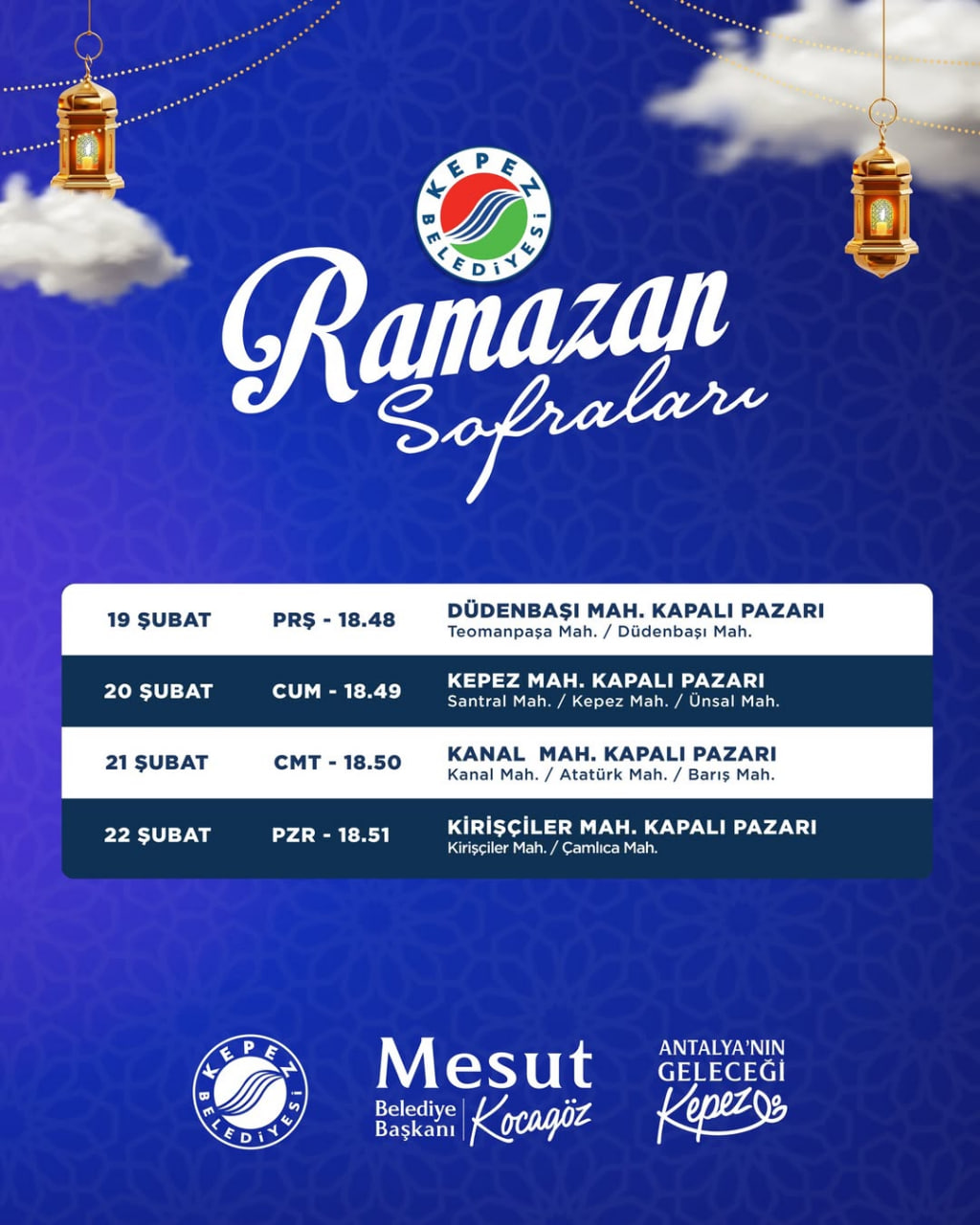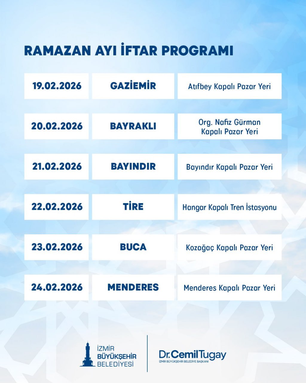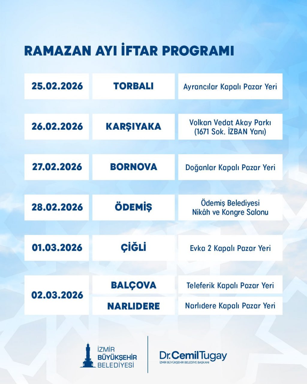 İzmir Büyükşehir Belediyesi ise ilçe ilçe planlanan Ramazan programı oluşturdu. Gaziemir, Karşıyaka, Bornova, Torbalı ve Ödemiş gibi farklı noktalarda her gün ayrı iftar organizasyonu yapılacak.