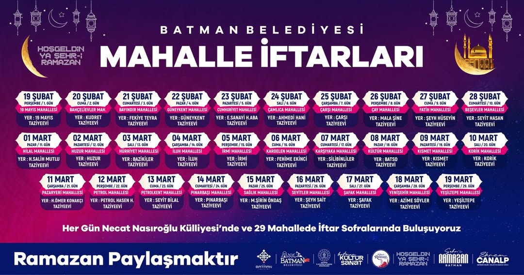 Büyükşehir meydanlarından mahalle pazar alanlarına kadar farklı noktalarda kurulacak sofralar sabit çadır, mobil ikram aracı ve paket dağıtımı şeklinde organize edilirken, il ve ilçe bazlı program listeleri de gün gün paylaşılmaya başladı.