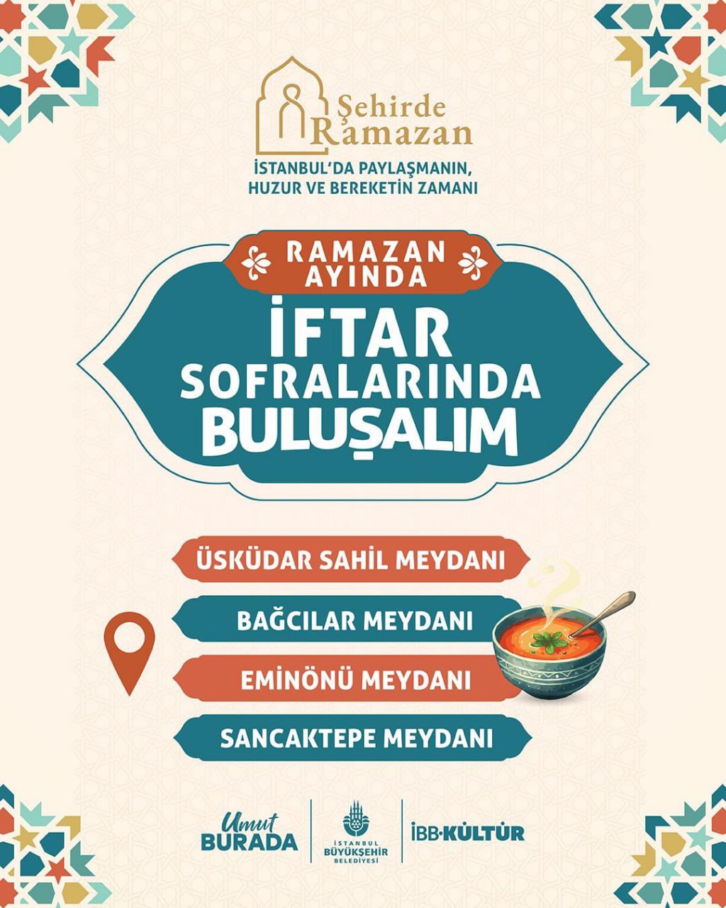 İstanbul'da meydan sofraları kurulacak. Üsküdar Sahil, Eminönü, Bağcılar ve Sancaktepe başta olmak üzere merkezi alanlarda vatandaşlar iftar yapabilecek. Ayrıca mobil ikram araçlarıyla iftariyelik dağıtımı da yapılacak.