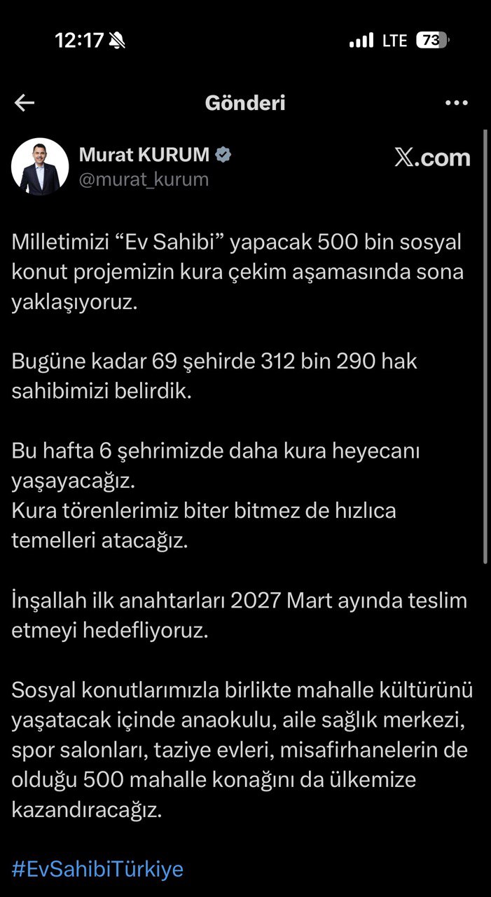 Çevre, Şehircilik ve İklim Değişikliği Bakanı Murat Kurum, ülke genelinde yürütülen 500 bin sosyal konut hedefi doğrultusunda 23 Şubat–1 Mart tarihleri arasındaki kura programını kamuoyuyla paylaştı. "Yüzyılın Konut Projesi" olarak duyurulan çalışmalarda takvimin aksatılmadan sürdüğünü ifade eden Kurum, bugüne kadar 69 ilde kura süreçlerinin tamamlandığını açıkladı.