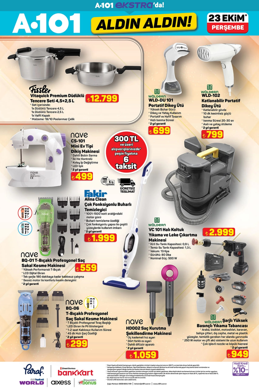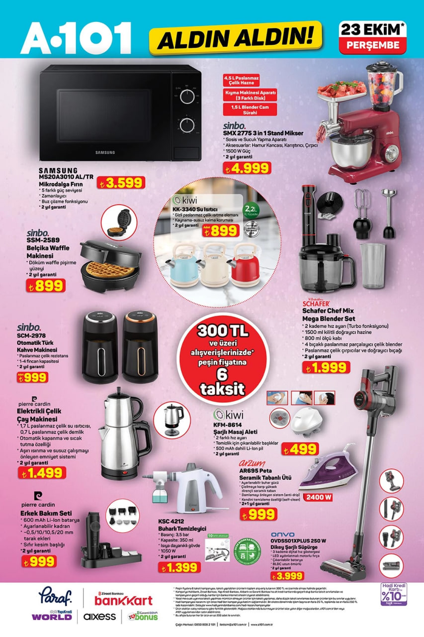 A101 marketlerinde 23 Ekim itibarıyla Aldın Aldın fırsatları başladı! Beyaz eşyadan küçük ev aletlerine, çeyizlik ürünlerden tadilat gereçlerine kadar onlarca ürün indirimli fiyatlarla satışta. Peki haftanın avantajlı ürünleri neler? İşte A101 Aldın Aldın aktüel kataloğunda öne çıkan fırsatlar…
