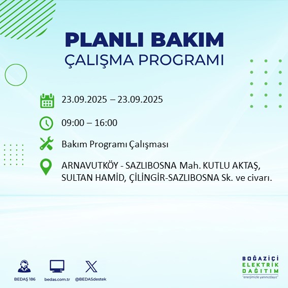 Etkilenen Cadde/Sokak: Sazlıbosna Mah. Kutlu Aktaş, Sultan Hamid, Çilingir-Sazlıbosna Sk. ve civarı, Karlıbayır Mah. Bilay, Cemre, Ekrem, Eski Edirne Asfaltı, Fikri, Mozaik, Rüştü, Tabur, Yücealp Sk. ve civarı, Hadımköy Mah. Niyaz Sk. ve civarı.