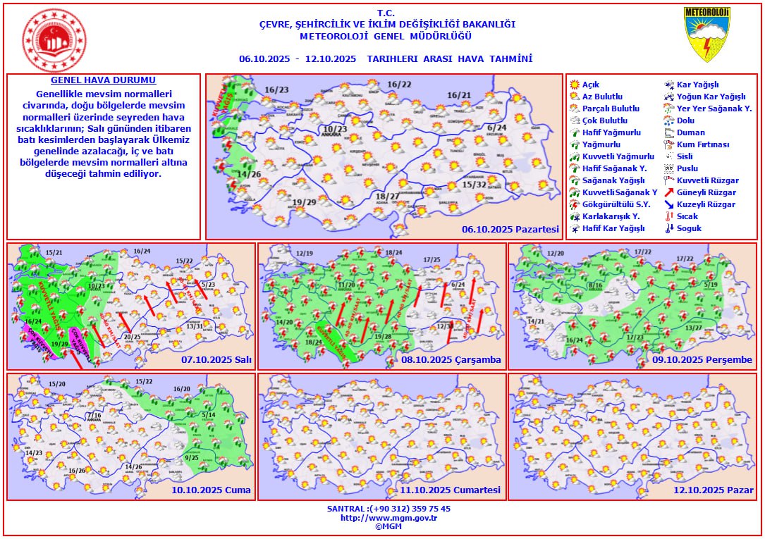 Türkiye yeni haftaya serin ve yağışlı bir havayla giriyor. Meteoroloji Genel Müdürlüğü'nün son tahminlerine göre, yurdun batı kesimlerinden başlayarak etkisini gösterecek yağışlı sistem, salı gününden itibaren iç ve doğu bölgelere doğru ilerleyecek. Hava sıcaklıklarının batı ve iç kesimlerde hissedilir derecede düşmesi bekleniyor.