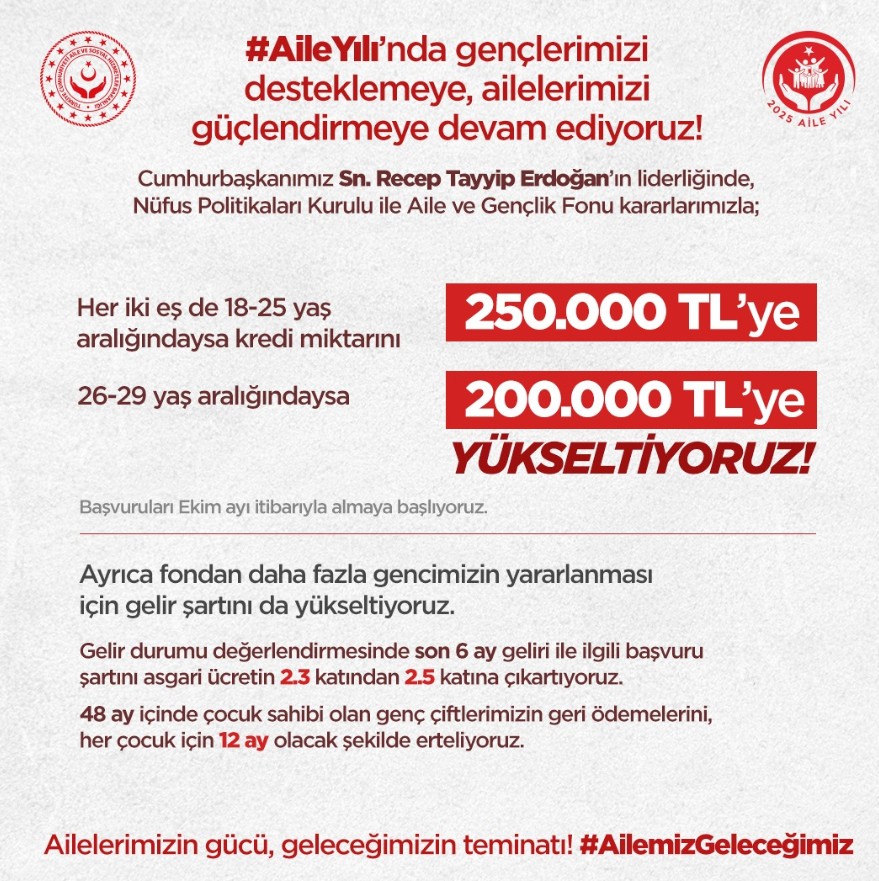 Aile ve Gençlik Fonu kapsamında Ocak 2026 itibarıyla kredi tutarının artırılacağı kaydedilen paylaşımda, "Her iki eş de 18-25 yaş aralığındaysa kredi miktarını 250 bin liraya, 26-29 yaş aralığındaysa 200 bin liraya yükseltiyoruz. Başvuruları ekim ayı itibarıyla almaya başlıyoruz. Ailelerimizin gücü, geleceğimizin teminatı." ifadeleri kullanıldı