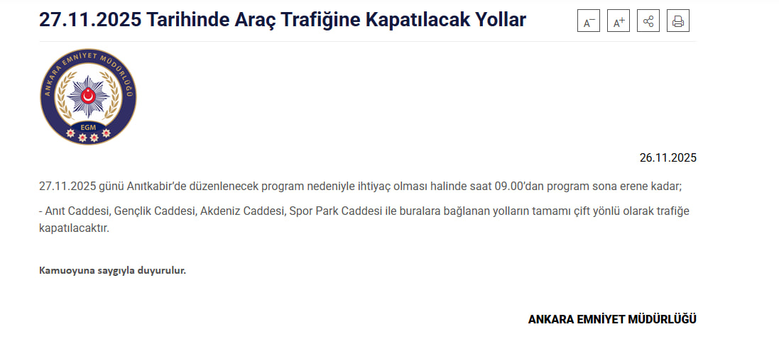 Ziyaret kapsamında güvenlik tedbirleri artırılırken, Ankara Emniyet Müdürlüğü trafiğe ilişkin uyarı yayımladı.