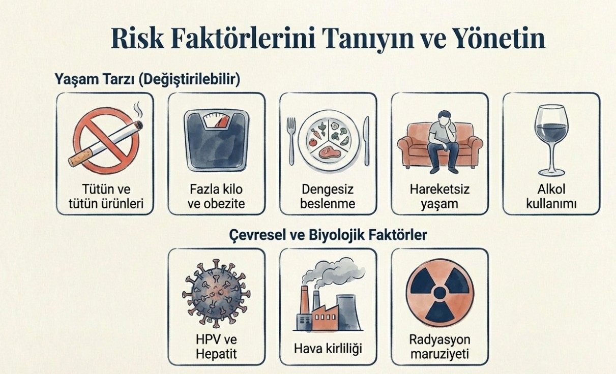 Bilimsel veriler, kanser vakalarının önemli bir bölümünün yaşam tarzı ve çevresel faktörlerle bağlantılı olduğunu göstermektedir. Tütün kullanımı, fazla kilo ve obezite, meyve-sebze tüketiminin yetersiz olması, fiziksel aktivite eksikliği ve alkol kullanımı başlıca risk faktörleri arasında yer almaktadır.